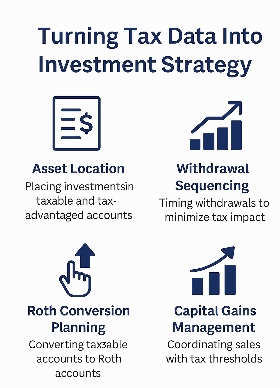 We use tax data to determine whether to pull from taxable accounts, IRAs, or Roths — and when.